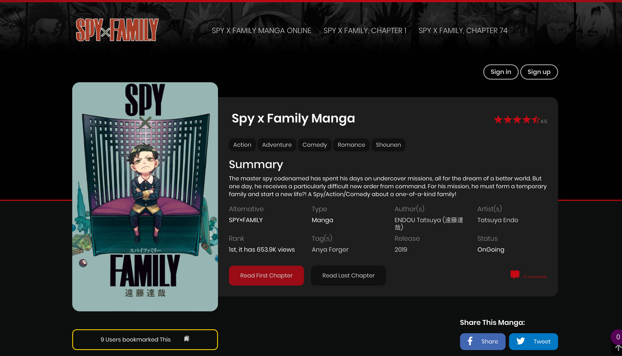 SpyXManga.com is a website dedicated to Spy X Family comics only. On this website, you can read the latest chapters of Spy X Family manga comics.